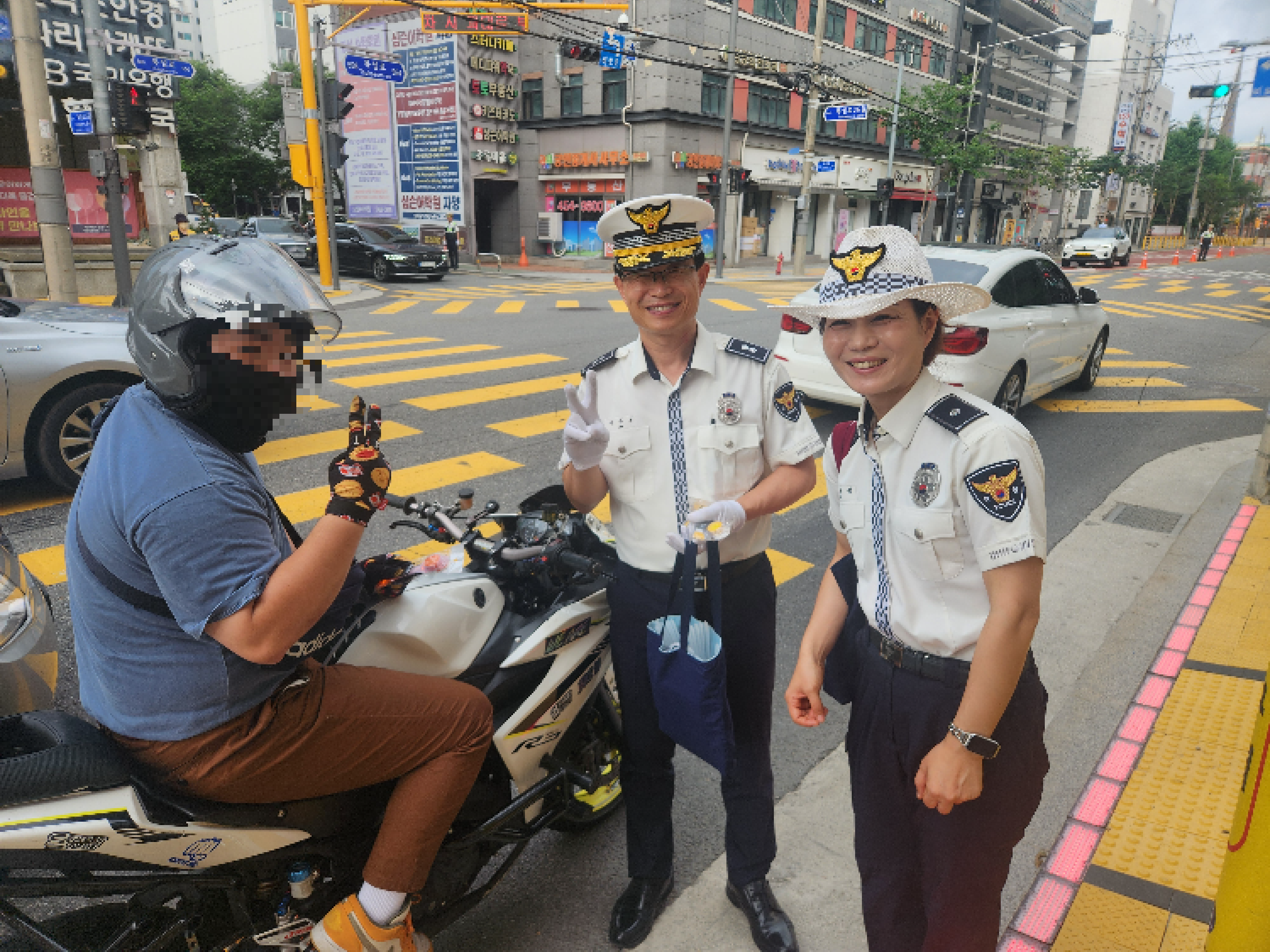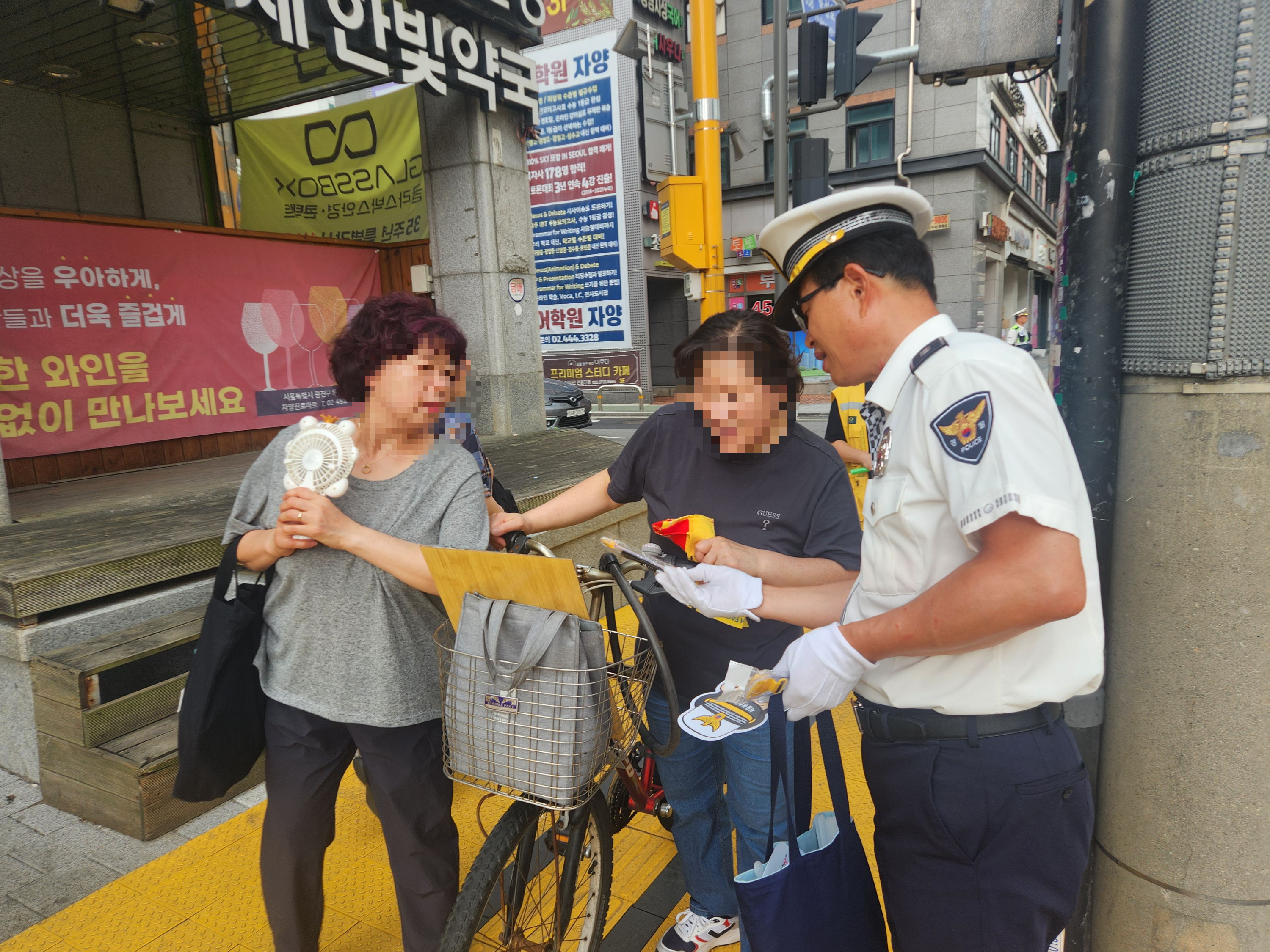 시민분들께 경찰 부채와 교통안전수칙이 담긴 홍보물품을 전달해 드리며 캠페인을 진행했는데요.