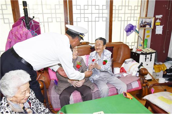 카네이션을 달아드리고 미소지으신 경로당 어르신의 모습이 참으로 훈훈합니다.^^