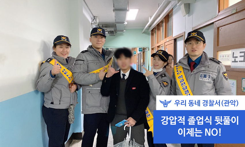 무사히 졸업하여 축하받는 졸업식에 잘못되고 강압적인 뒤풀이를 예방하기 위해 관악경찰서가 앞장 서겠습니다!