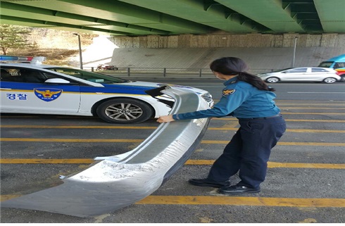 급히 비상등과 사이렌을 울리며 진행하는 버스에게 서행 유도 및 정차시켜 파손물 수거!