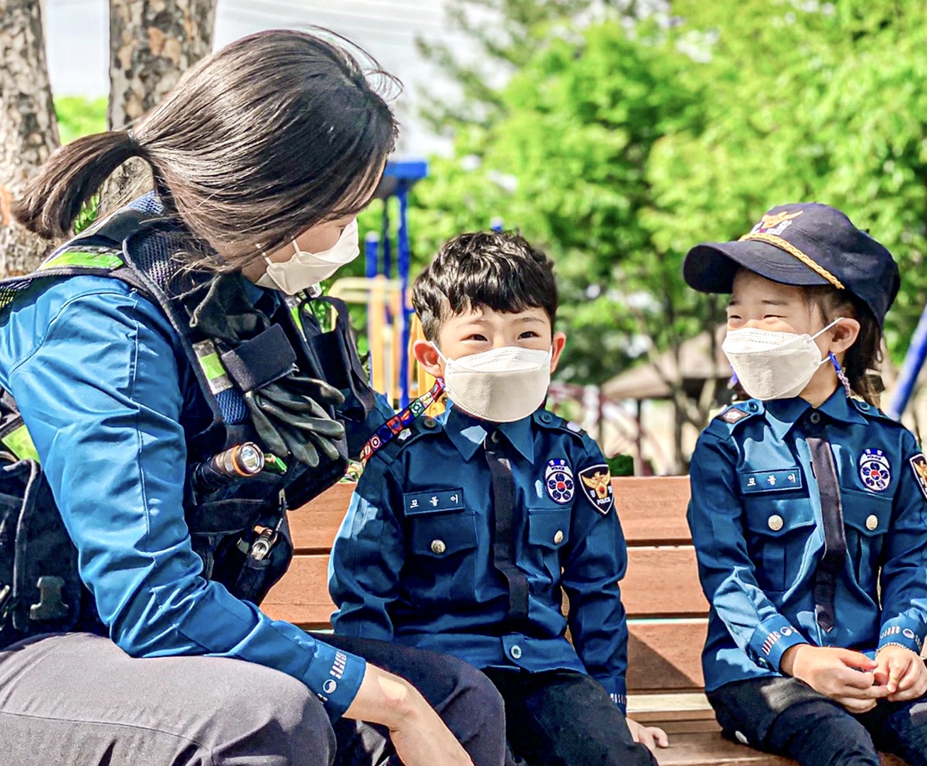 서울경찰이 어린이들의 눈높이에 맞추어 소통하는 사진이