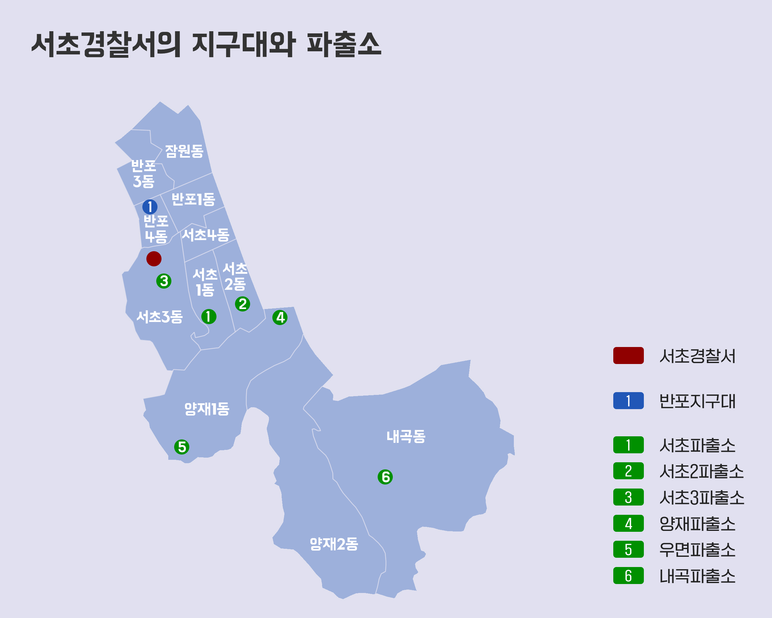 서초경찰서는 1개의 지구대(반포)와 6개 파출소(서초, 서초2, 서초3, 양재, 우면, 내곡)를 운영하고 있습니다.