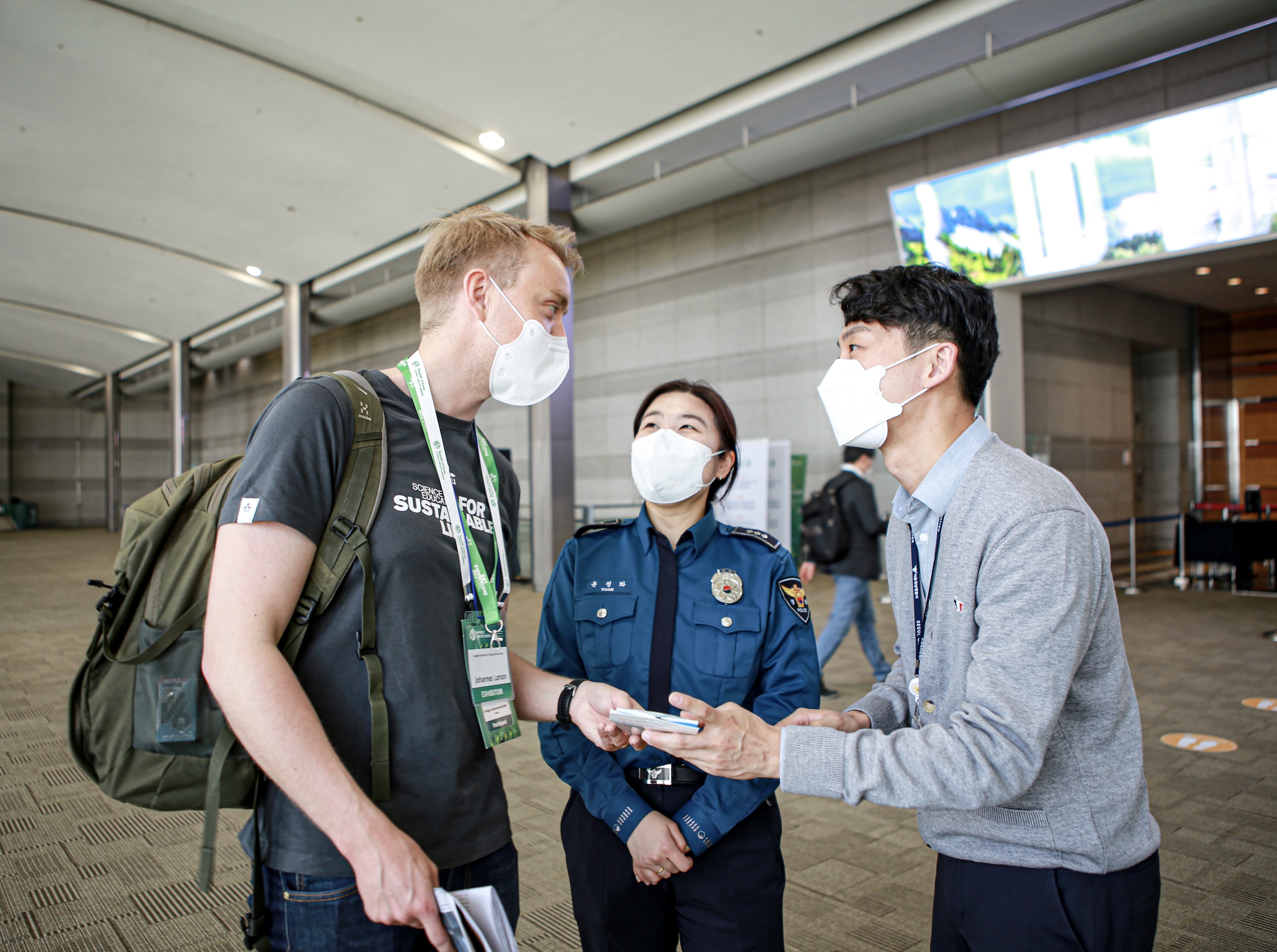 박람회에 온 외국인들에게 영어로 제작된 범죄 예방 리플렛을 배부하며