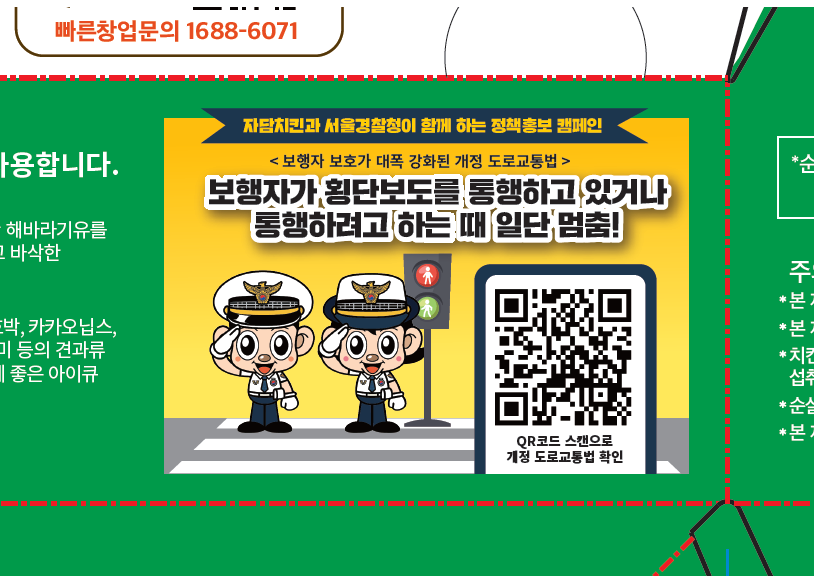 그 첫번째 주제로 개정 도로교통법을 선택하여 법률 주요 내용과 교차로 우회방법에 대해 설명이 잘 되어있는 홍보영상 QR코드를 ㈜웰빙푸드 자담치킨 박스에 삽입하게 되었습니다.