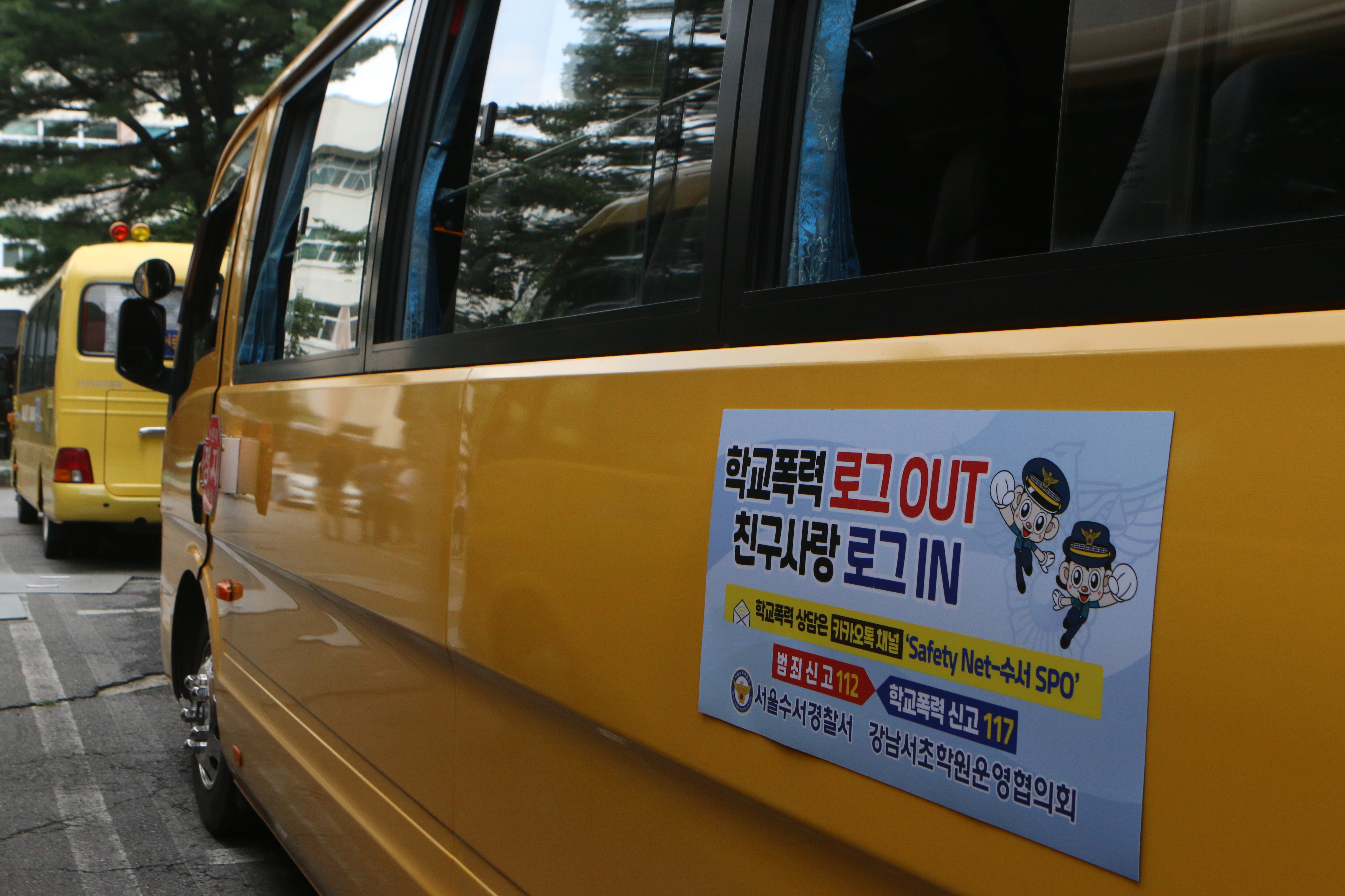 학교폭력 예방 문구가 적힌 자석식 홍보물을 부착