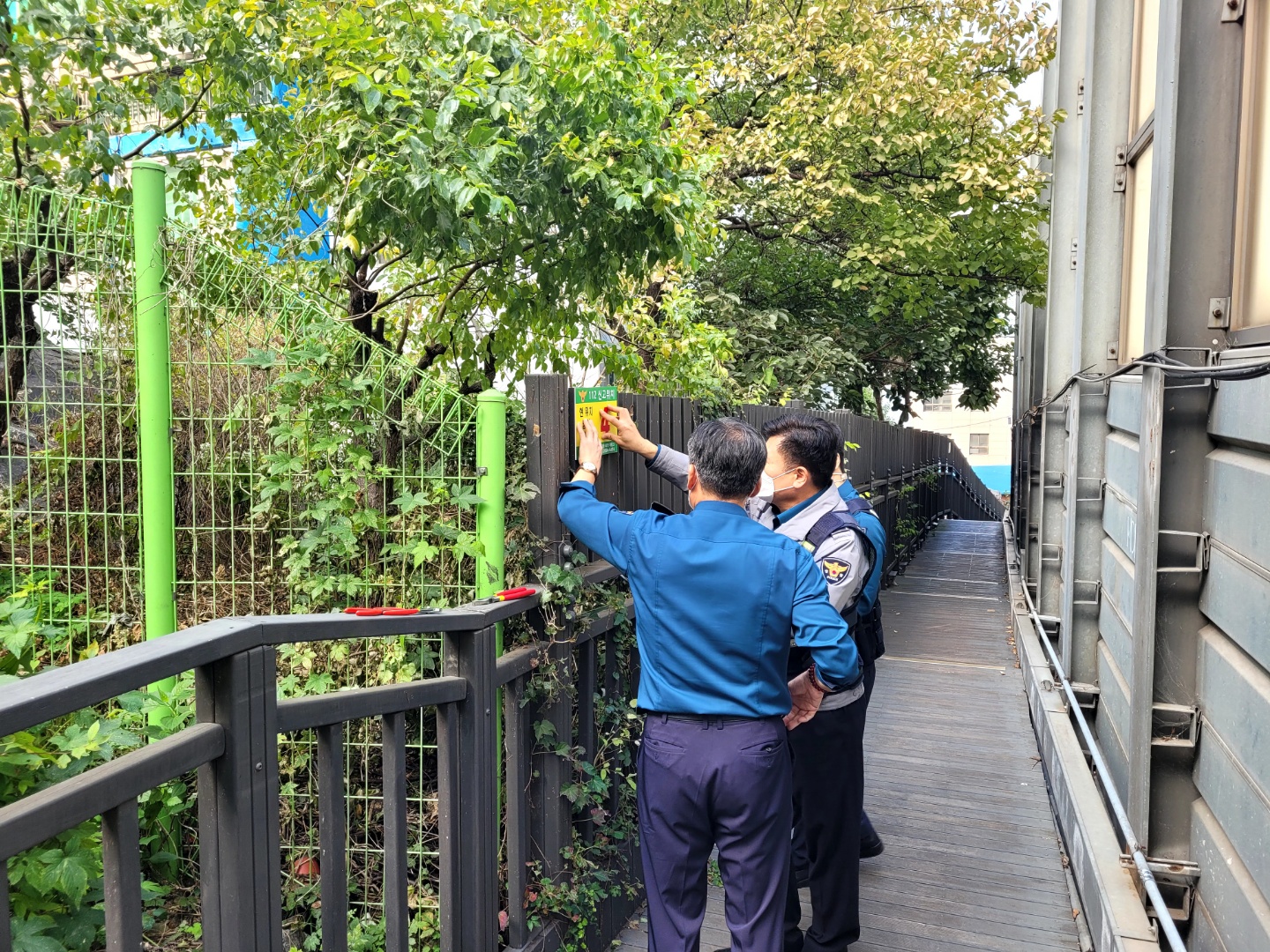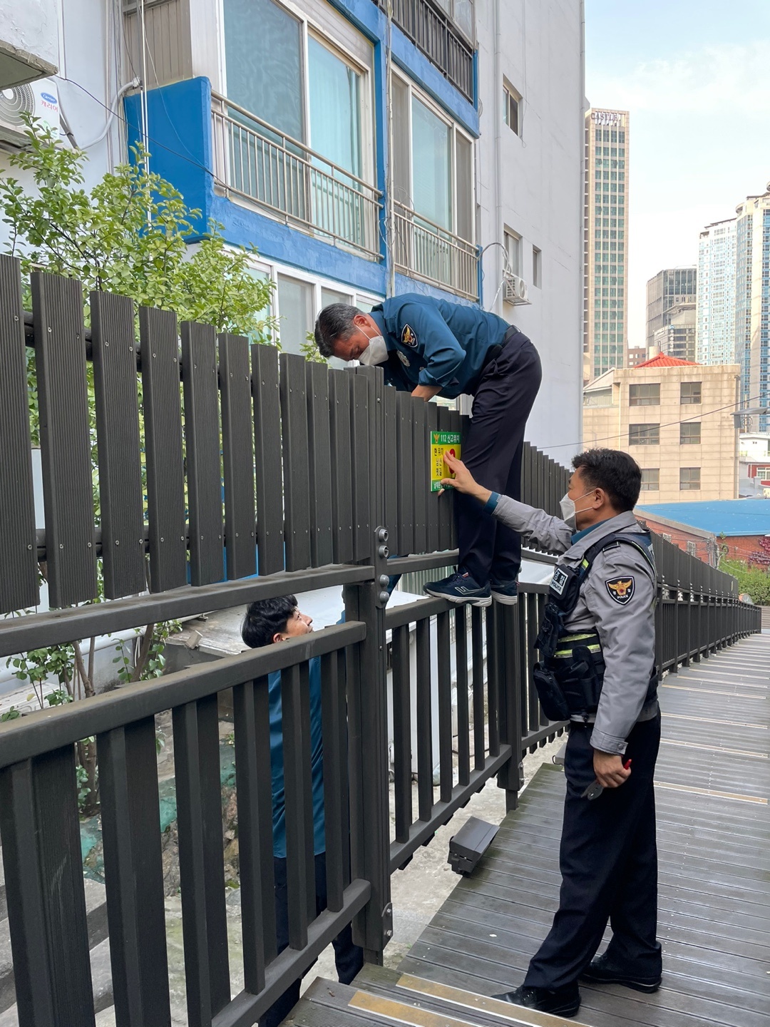 파출소장님은 직접 난간 위에 올라가서 시민들의 눈에 잘 띄는 장소에 위치판을 부착하였습니다.