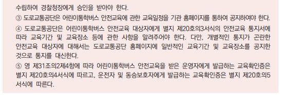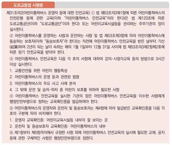 참고로, 통학버스 운영자 및 운전자에 대한 안전교육은 도로교통공단 또는 어린이교육시설을 관리하는 주무기관의 장이 3시간 이상 실시하도록 규정하고 있으며,