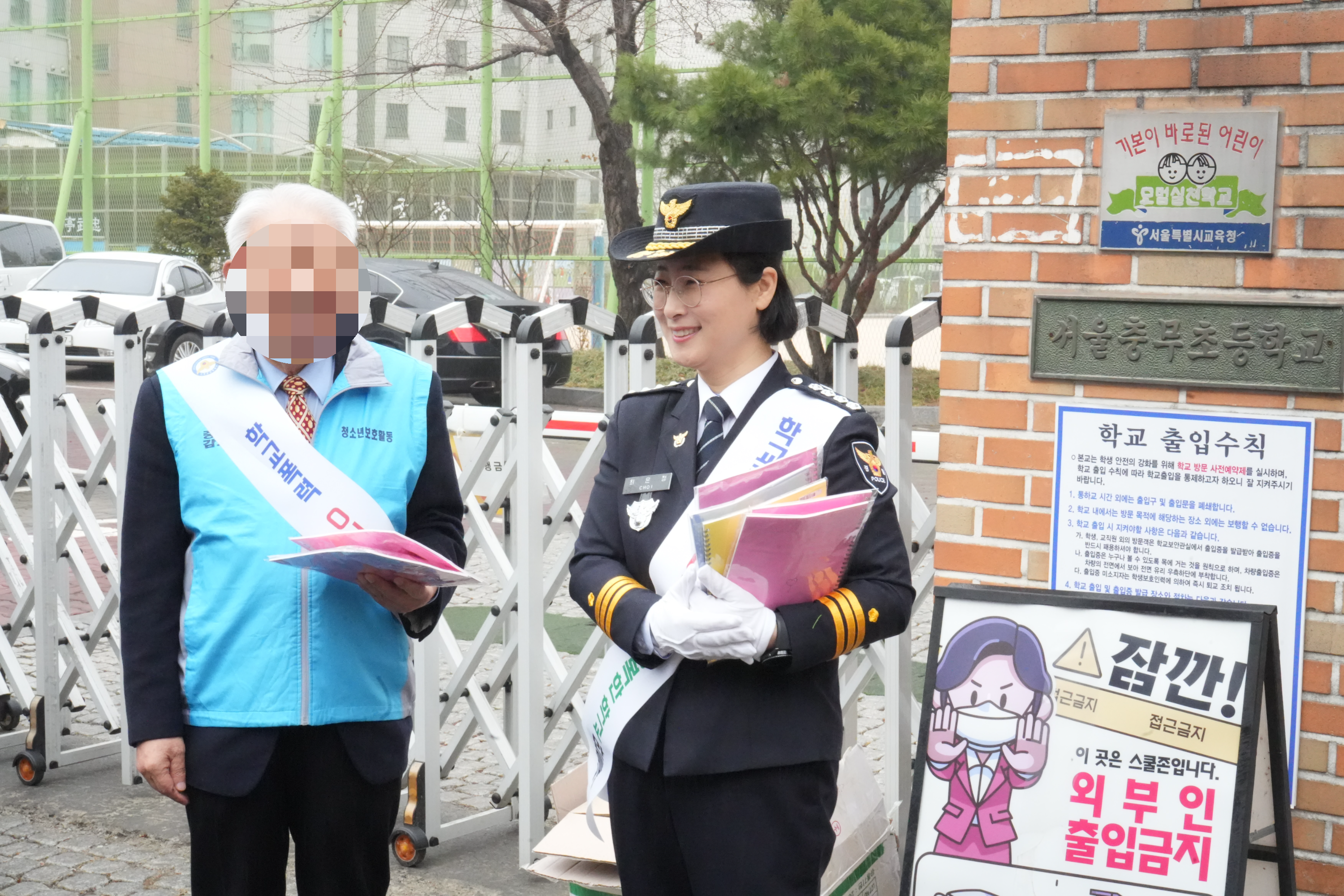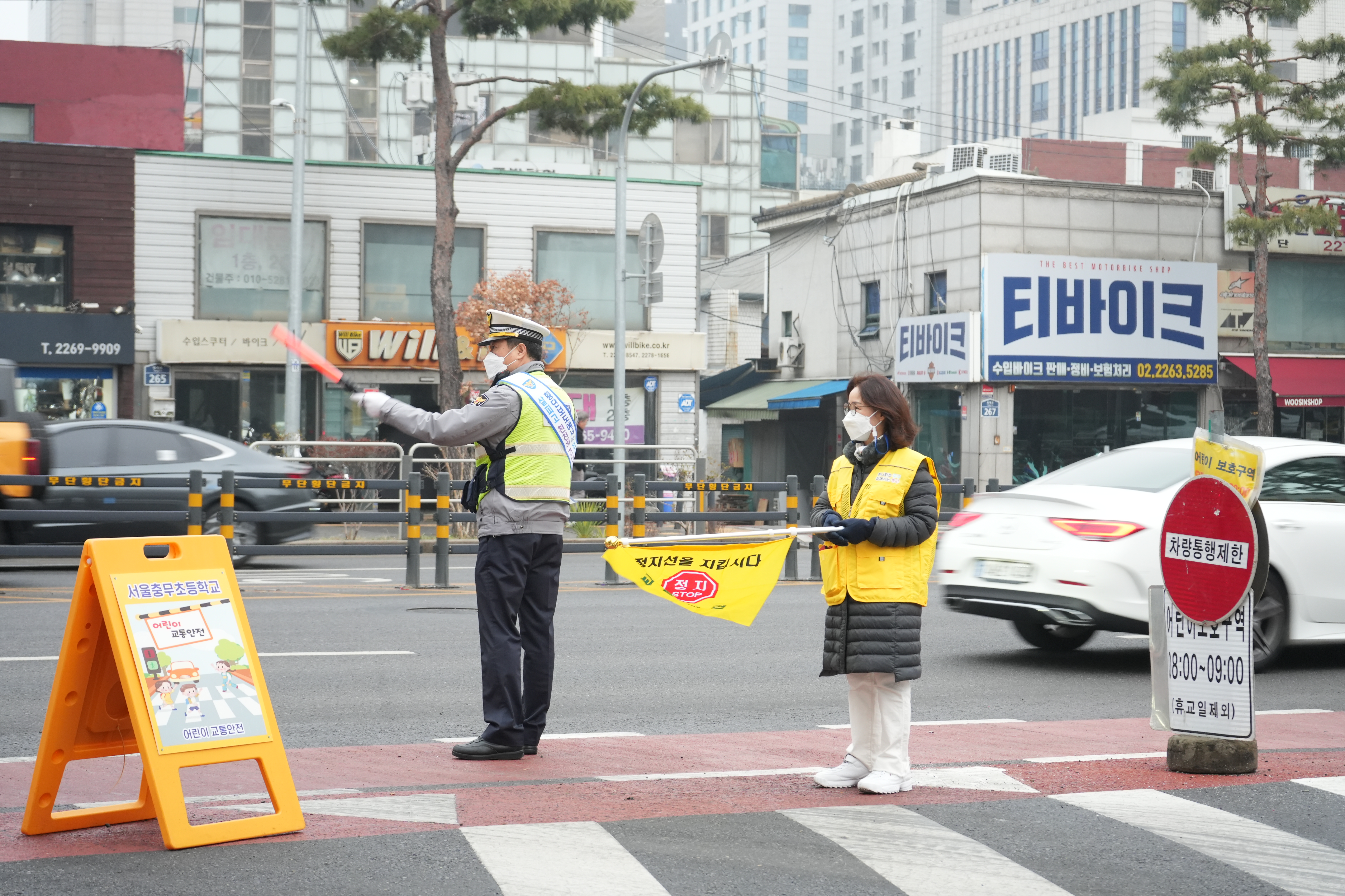 충무초등학교 주변에서 교통경찰과 등굣길 안전지킴이의 교통지도를 시작으로,