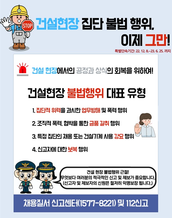 이런 행위로 인해 공사기간 지연, 비조합원 등에 대한 공정한 채용 기회 박탈 등 사회 문제로 고착화되어 왔는데요!
