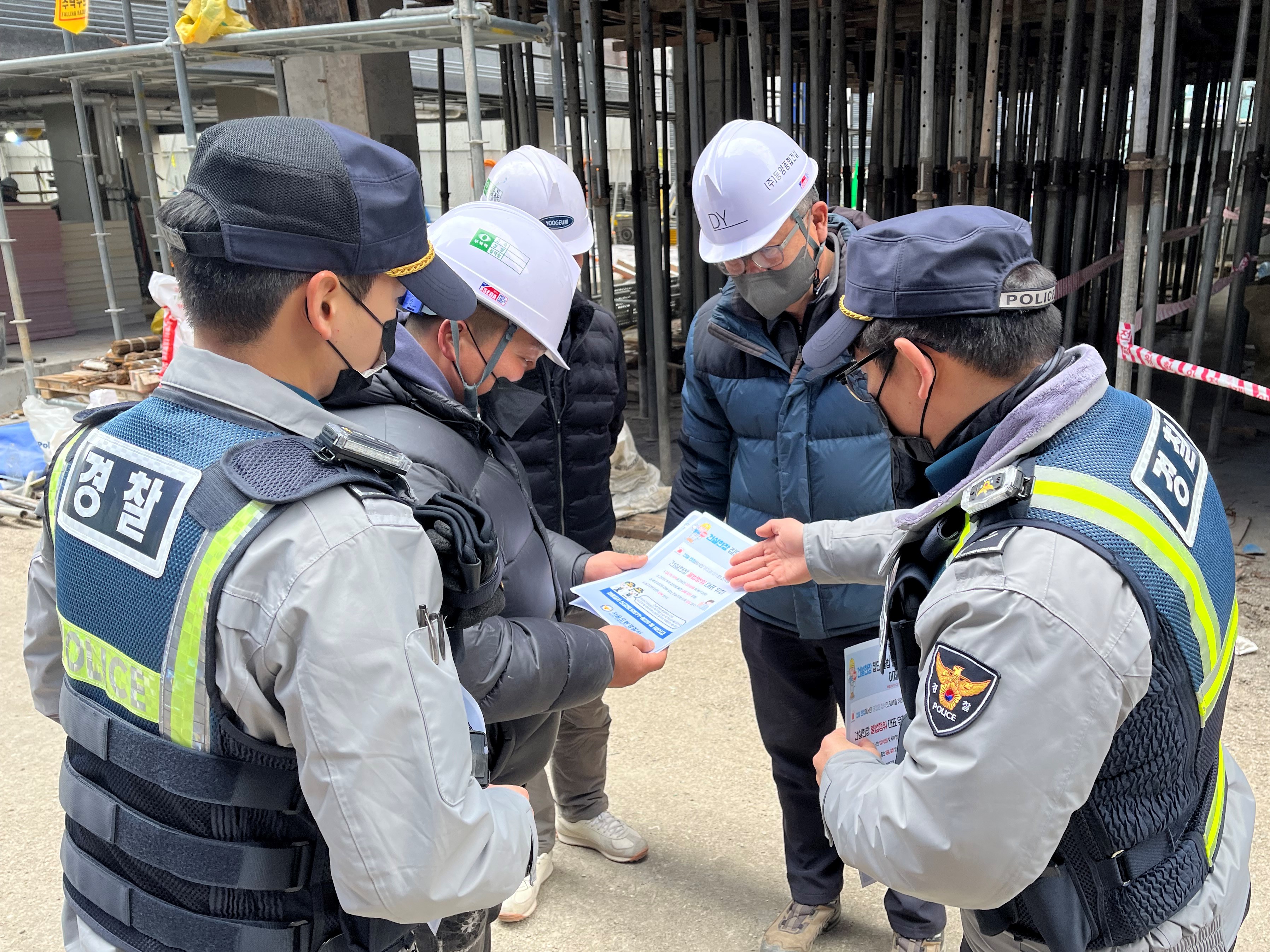 도봉1파출소에서는 건설현장 질서유지와 공정성을 위해 전단지를 배포하며 건설현장불법행위의 심각성을 알리고 적극적으로 신고할 수 있도록 건설현장에 방문하여 예방 활동을 실시했습니다.