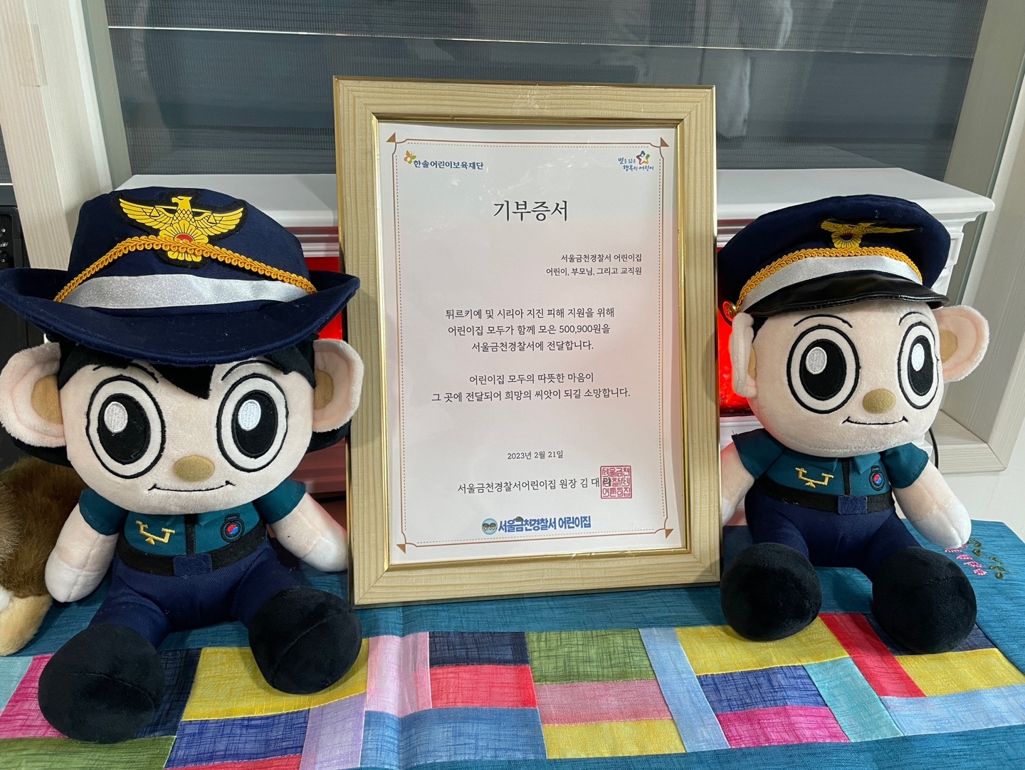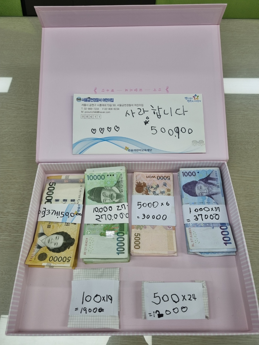 고사리같은 손으로 기부금을 한 자 한 자 적어, 500,900원을 금천경찰서에 전달해주었습니다.