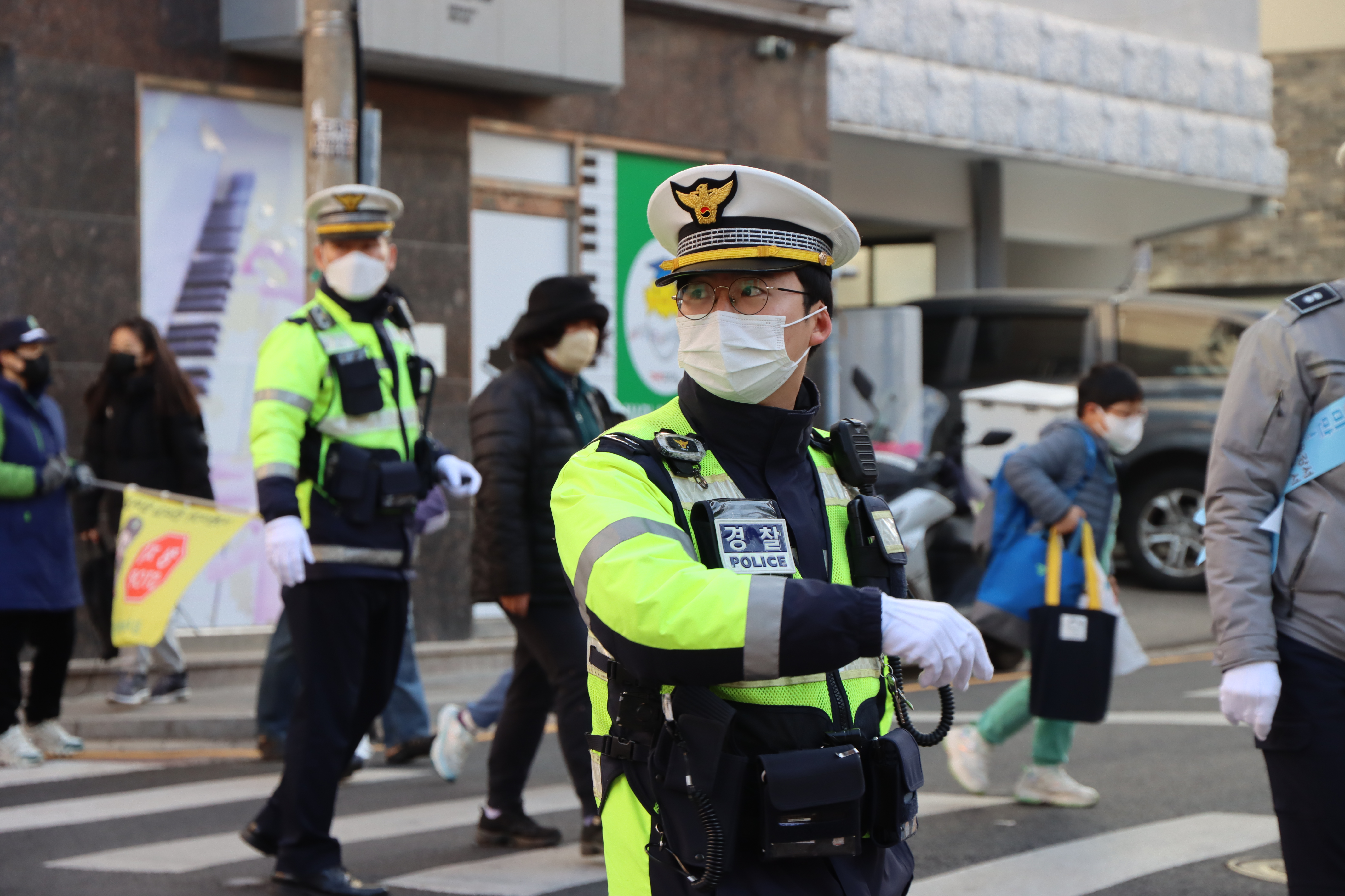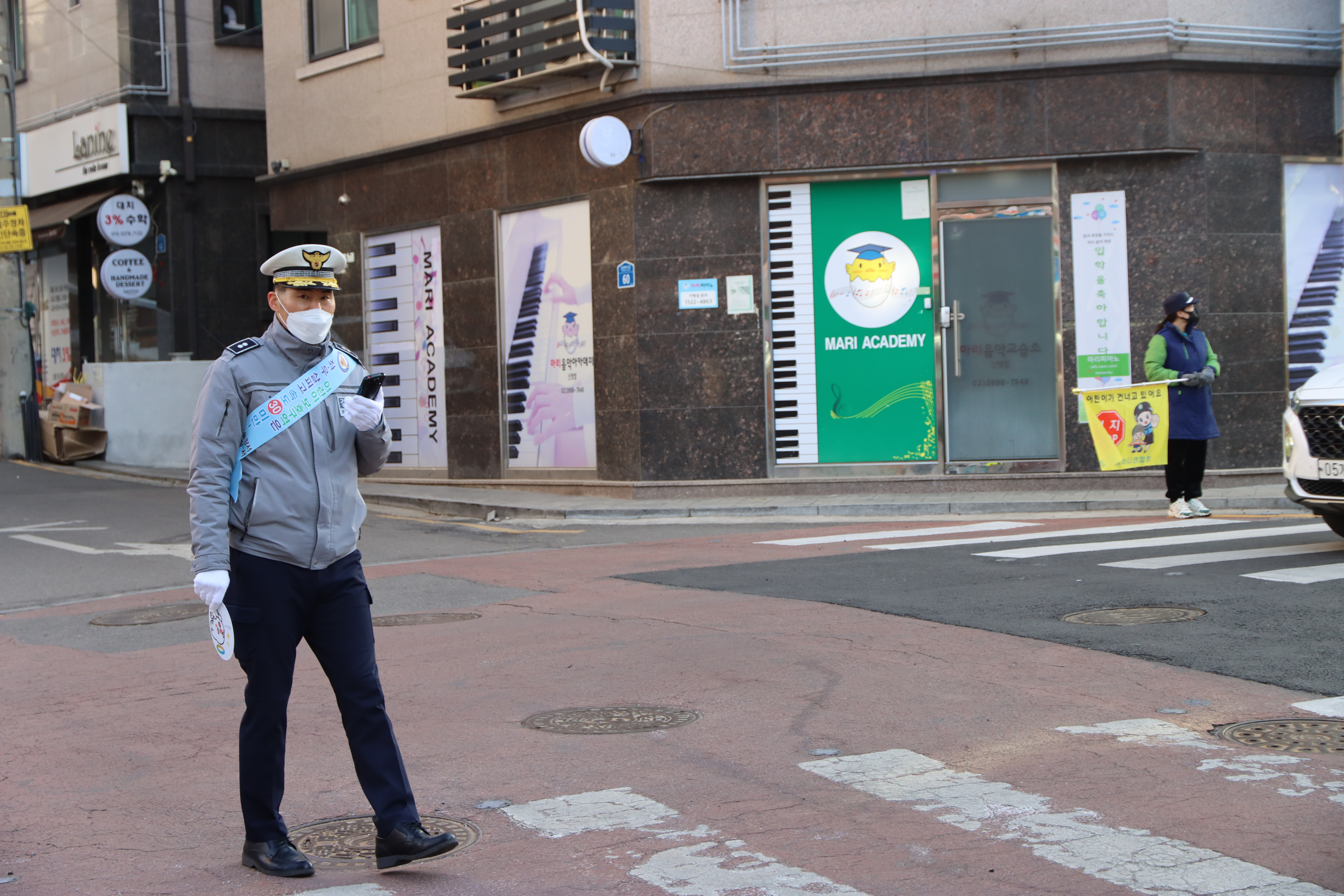 안전한 등굣길을 위한 캠페인/교통정리를 실시했습니다.