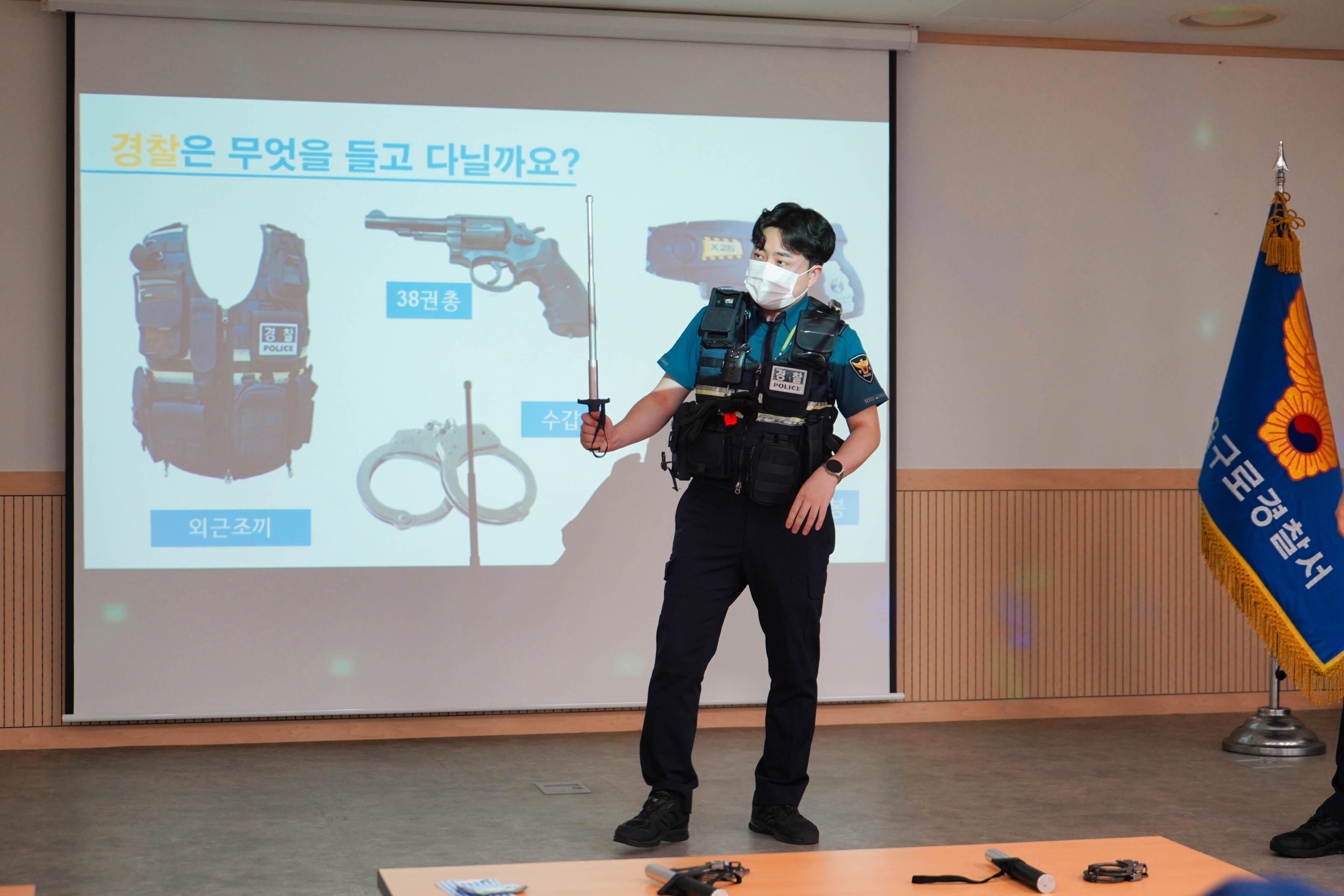 수갑, 삼단봉, 테이저건, 38권총 등 경찰 장구 설명하고 체험하는 시간을 가졌습니다