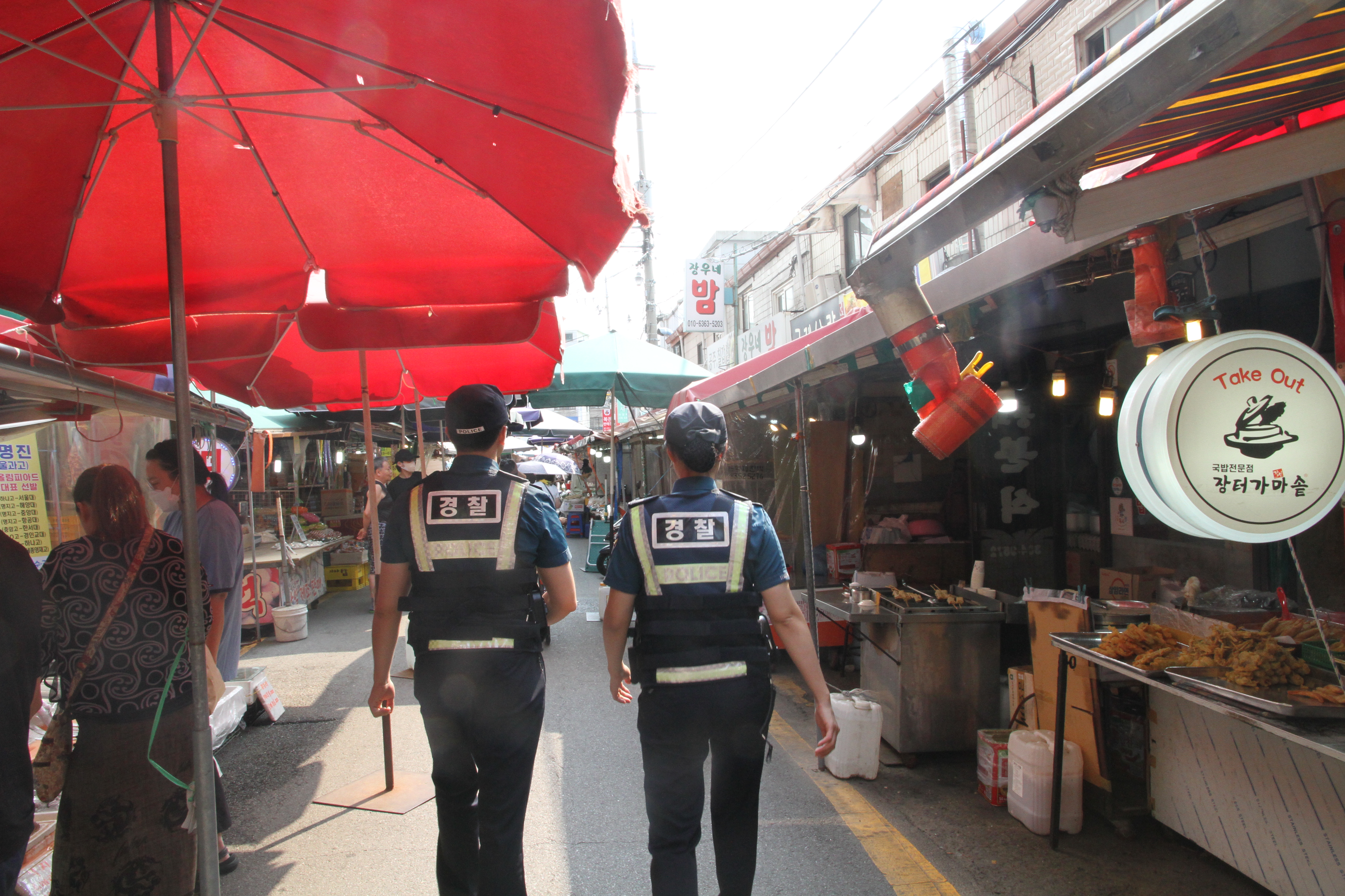 경찰관들은 전통시장을 순찰하며 주민들을 안전하게 보호하고, 금전 거래와 관련된 범죄나 사기 행위를 예방하기 위해 노력합니다.