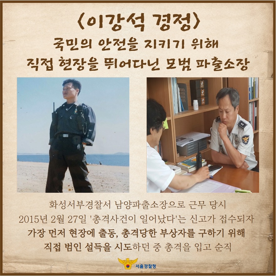 이강석 경정은 2015년 2월 27일 경기남부 화성서부경찰서 남양파출소장으로 근무 당시