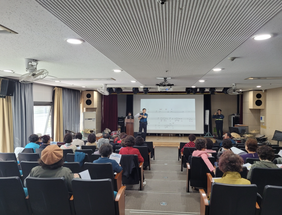 지자체 프로그램인 주민여가 노래교실 시작 전 100여명 어르신과 함께 교육을 실시하였습니다.