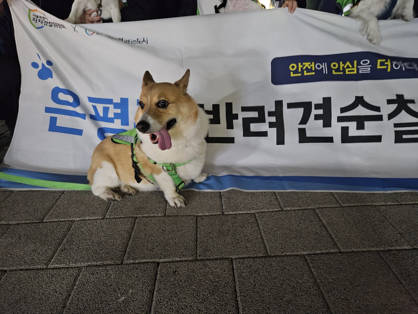 오늘은 반려견들은 주인들과 똑같이 반려견 순찰대라는 형광색 옷을 입고 은평구 안전을 위해 순찰을 하였습니다.