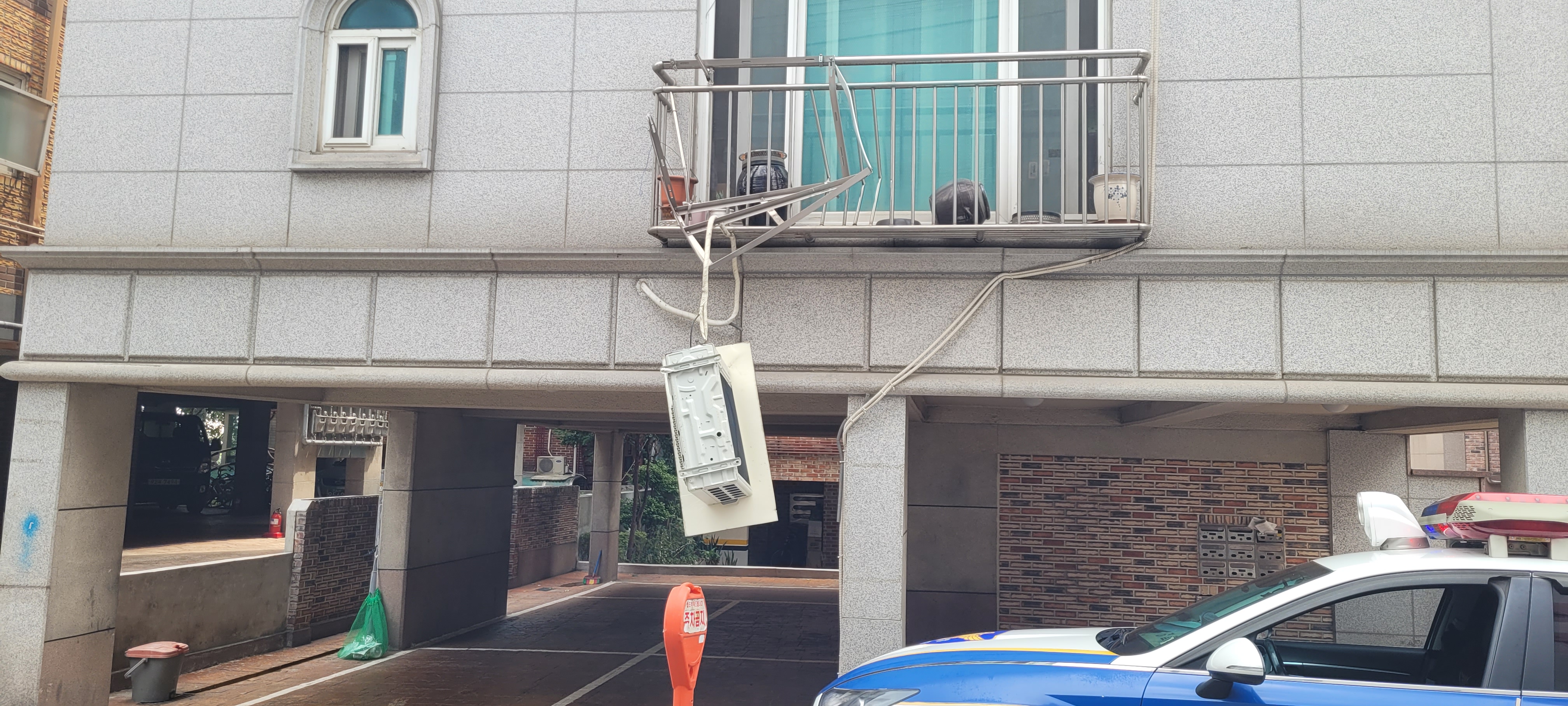 빌라 외벽의 실외기가 파손되어 매달려 있는 것을 발견하여,