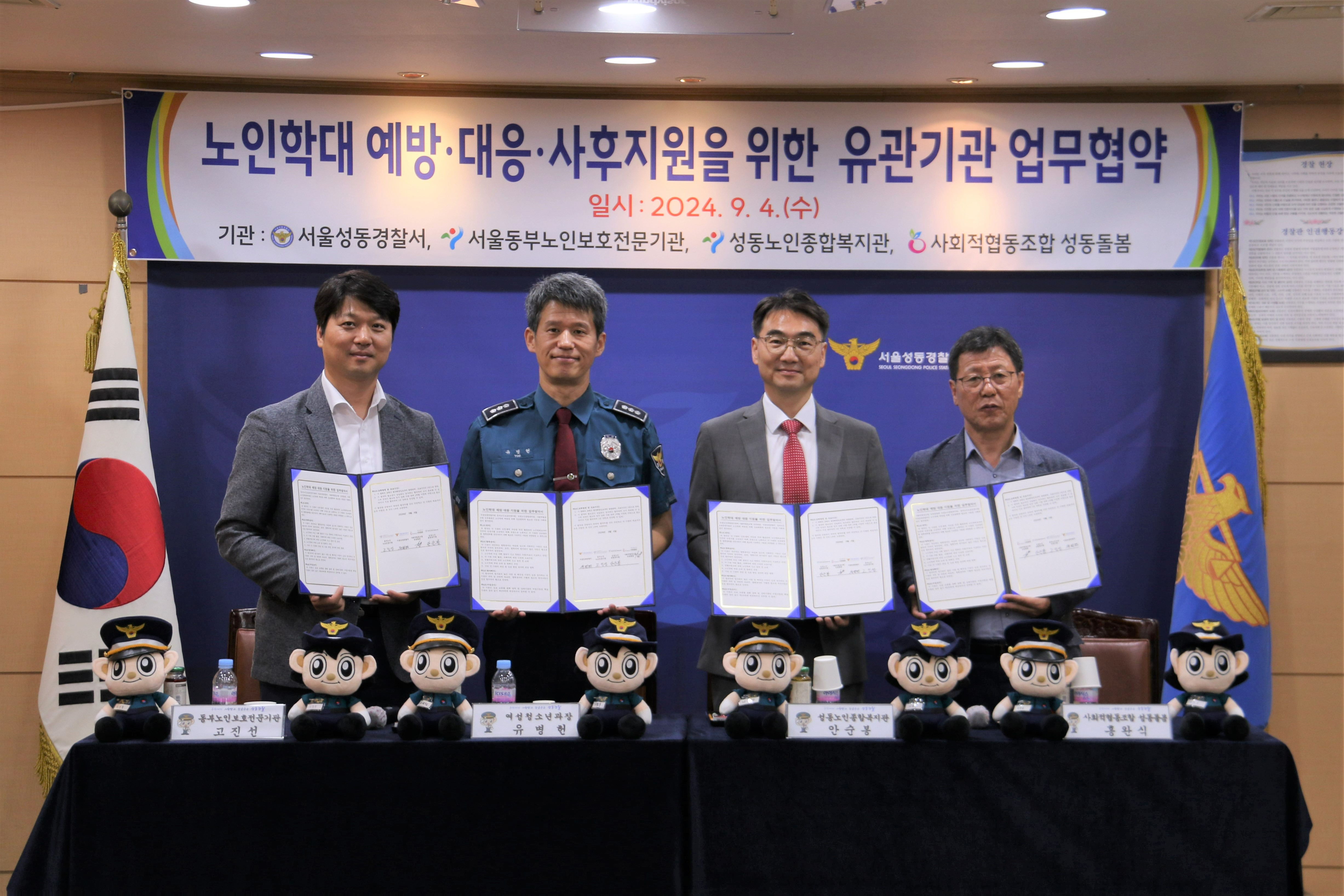 안녕하세요 성동경찰서입니다. 각 경찰서에는 여성, 청소년, 노인 등 범죄에 취약한 사회적 약자를 보호하기 위한 여성청소년과가 있는데요. 이번에는 성동경찰서 여성청소년과에서 체결한 업무협약을 통해 사회적 약자 보호를 통한 사회안전망 강화 활동을 같이 보시겠습니다. 우선, 노인학대 방지를 위한 업무협약을 체결했습니다. 보건복지부에 따르면 노인학대 신고는 최근 5년간 꾸준히 증가세를 보이고 있습니다. 노인학대는 특성상 피해자인 노인이 직접 신고하는 경우가 극히 드물기 때문에, 주변인의 관심이 특히 중요합니다. 성동경찰은 이 같은 특성을 감안하여, 성동노인복지관, 성동돌봄센터에 등록된 '생활지원사'를 '어르신 지킴이 서포터즈'로 발족했습니다. 이를 통해 학대받는 노인을 적극적으로 발굴하고, 각 기관과의 유기적 협력으로 종합적인 보호 및 피해 예방을 전개해 나갈 예정입니다. 한편 최근 화두로 떠오른 딥페이크를 이용한 범죄에 대응하려는 노력도 지속하고 있습니다. 특히 전국 최초로 서울시여성가족재단(서울디지털성범죄안심지원센터)과 협업, 딥페이크 교육자료를 제작했습니다. 자료에는 딥페이크의 의미, 처벌사례, 피해 발생 시 대응요령 등을 담았습니다. 교육자료를 연령별, 대상별로 세분화해 모든 세대가 딥페이크 범죄의 심각성과 대응요령을 이해할 수 있게끔 했습니다. 성동경찰은 이 교육자료를 토대로 10월부터 성동구 내 학교에서 교육을 실시해 나갈 예정입니다. 감사합니다.