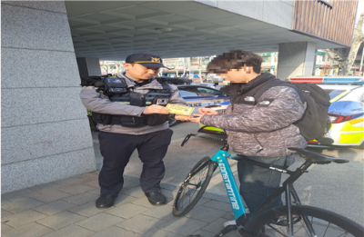 자전거를 타고 다니는 학생 및 시민 분들에게도 전달하여 자전거 절도 범죄를 예방할 수 있도록 안내하였습니다.